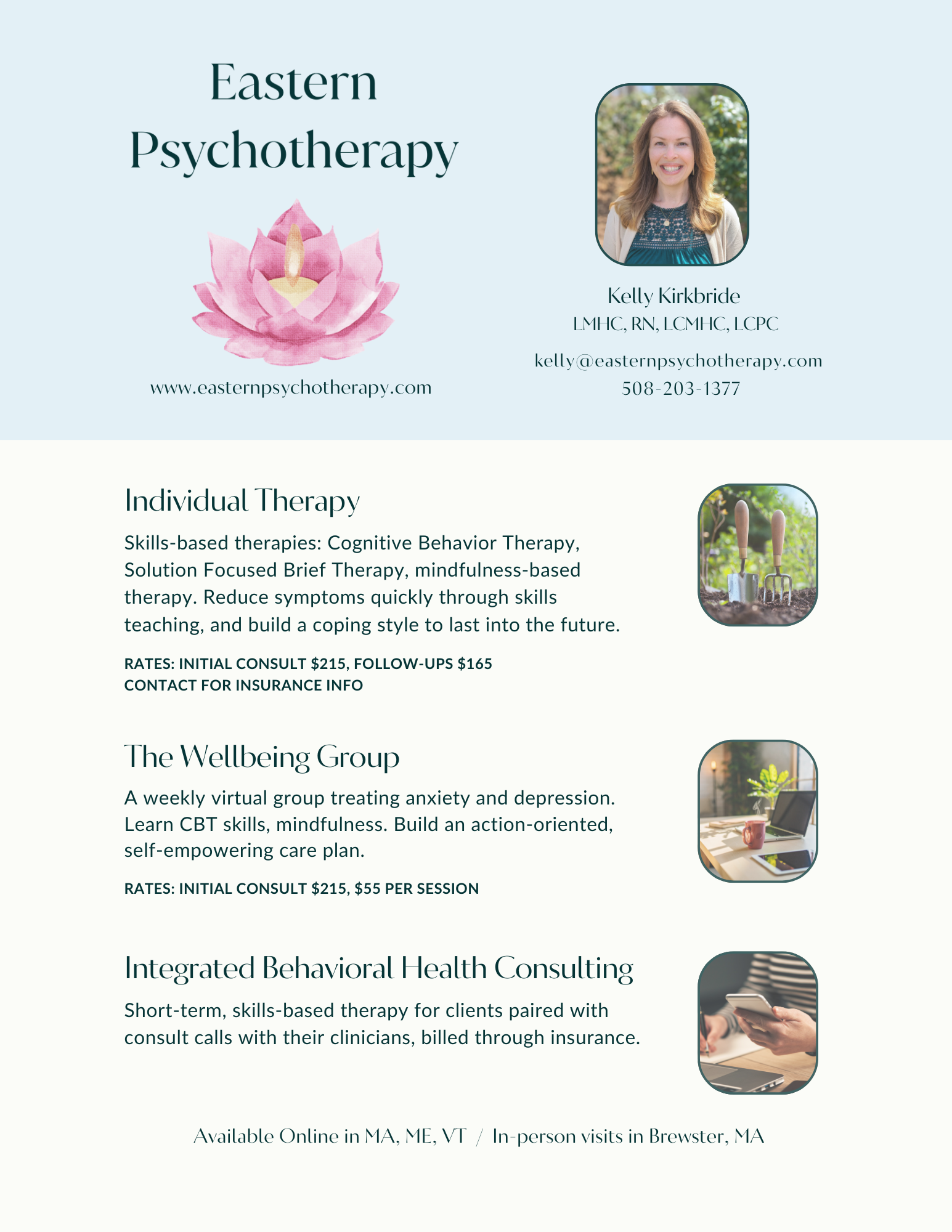 Most recently, I have been combining mindfulness with Cognitive Behavior Therapy. I teach how to use mindfulness principles of compassion, non-attachment, living with intention, and serving the community. I combine these principles with the cognitive skills for “rewiring” thought patterns. Together, these skills facilitate meaningful change in the mind and heart.